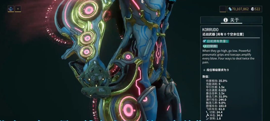 库鲁多是一把外形酷似巨牙重击者气动捶地机的Grineer风格近战武器,属于搏击类武器,需要仓鼠们达到9段才能使用。这把武器最突出的特点就是夸张的冲击伤害和优秀的暴击属性,虽然攻速偏慢但每一拳都充满力量感,特别适合喜欢重击玩法的仓鼠。