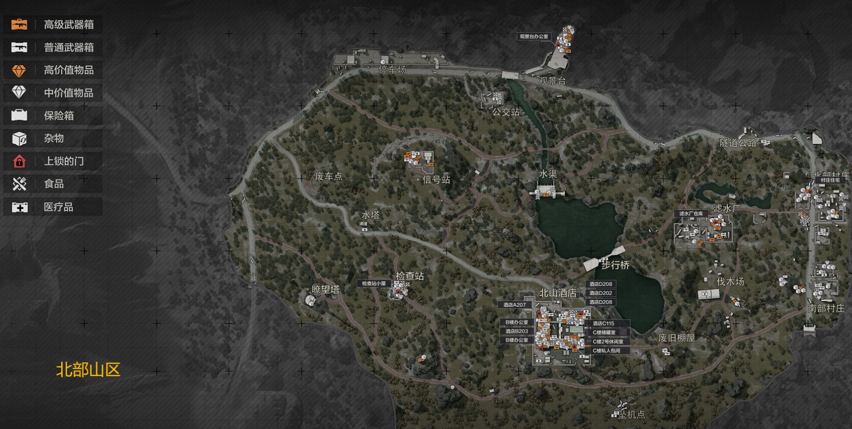 山谷和北山是两张资源分布差异显著的地图。山谷以海滨别墅为核心高价值区,物资集中但竞争激烈;北山则以酒店和污水处理厂为资源枢纽,地形复杂且战略纵深更大。两张地图的物资总量相近,但获取难度和风险系数截然不同,需根据战术需求选择。