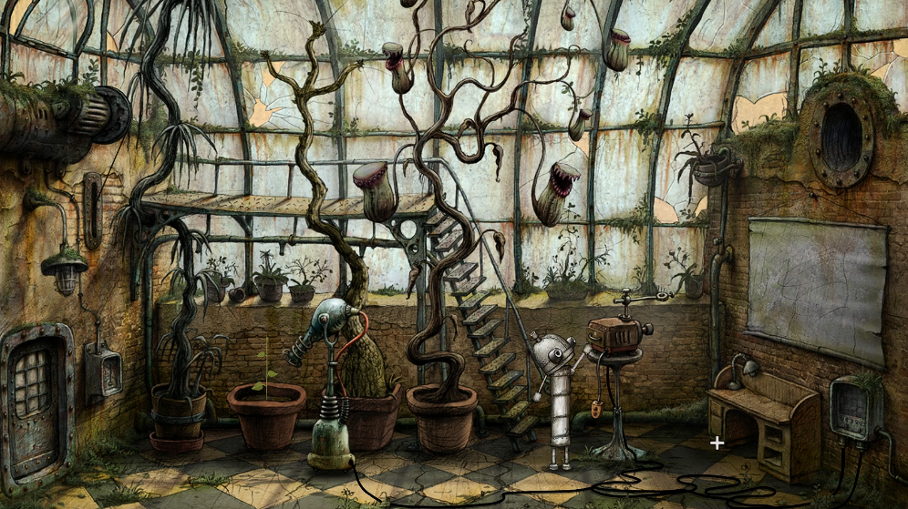 最后用葵花油交换轮椅机器人给的绷带和游戏厅门票。这时候可以前往新场景继续冒险。整个第11关的核心就是观察细节——蝴蝶红点、向日葵提示都是重要线索,配电盒的路径选择需要点耐心,温室里每台机器都有用处,幻灯机、加热器、配电盒环环相扣。特别提醒要故意答错排气扇的题目让它坏掉,这是进入温室的前提。