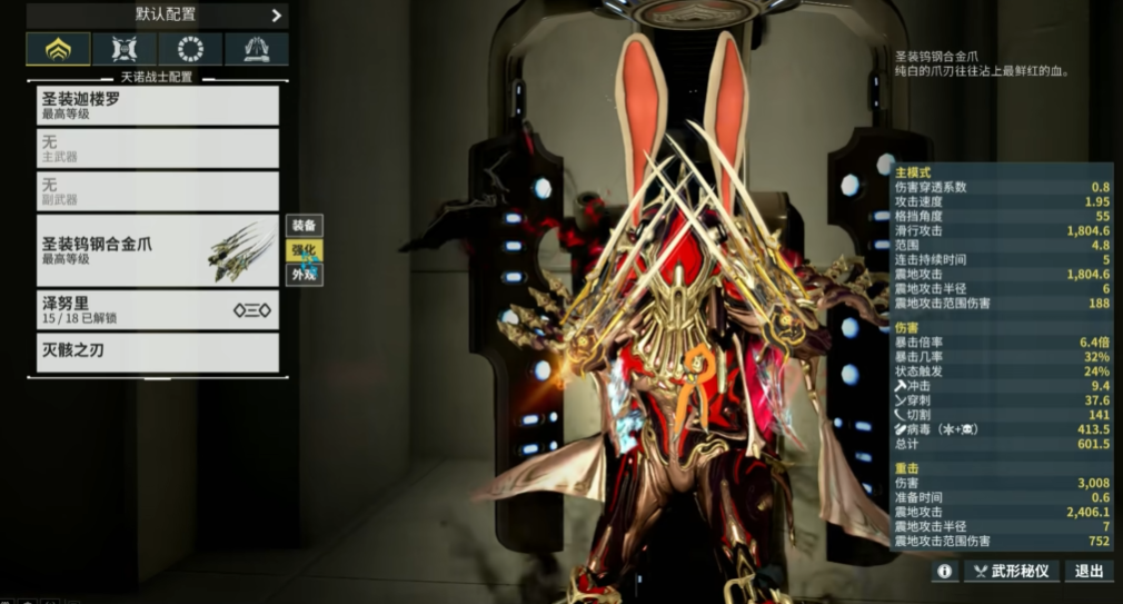 武器选择需结合战甲特性与作战场景。鞭类武器适合大范围控场,但面对高护甲单位时需依赖异常状态触发;双剑类武器对群效率优异,但单体爆发略逊于重击型武器;凯旋之爪Prime等重击特化武器则更适合对抗高优先级目标。所有顶级近战武器的共同点是均需极化至少3次以容纳完整MOD体系,且必须配置急进猛突、异况超量等核心MOD。MOD配置对武器强度的影响远超武器基础属性。即使次级武器在完整MOD支持下也能达到通关标准,因此资源有限的玩家应优先投资MOD而非盲目追求顶级武器。病毒切配卡已成为当前版本近战武器的通用解决方案,通过病毒异常状态提升伤害倍率,再通过劈砍伤害触发出血效果。这种配置下,武器的触发率与暴击率需保持至少20%以上才能确保输出稳定性。