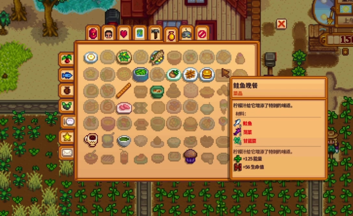 烹饪的前提是掌握食谱,游戏中有多种途径获取食谱。基础食谱可通过观看电视的烹饪节目、与村民提升好感度后获得,部分特殊食谱需完成特定事件或节日活动解锁。食谱解锁后,若材料不足会显示红色标注提示,材料齐全时食谱图标变为高亮彩色。烹饪过程不消耗游戏内时间,点击即可完成。