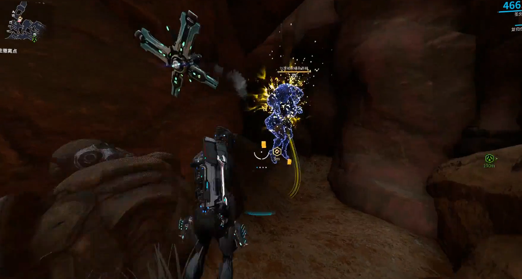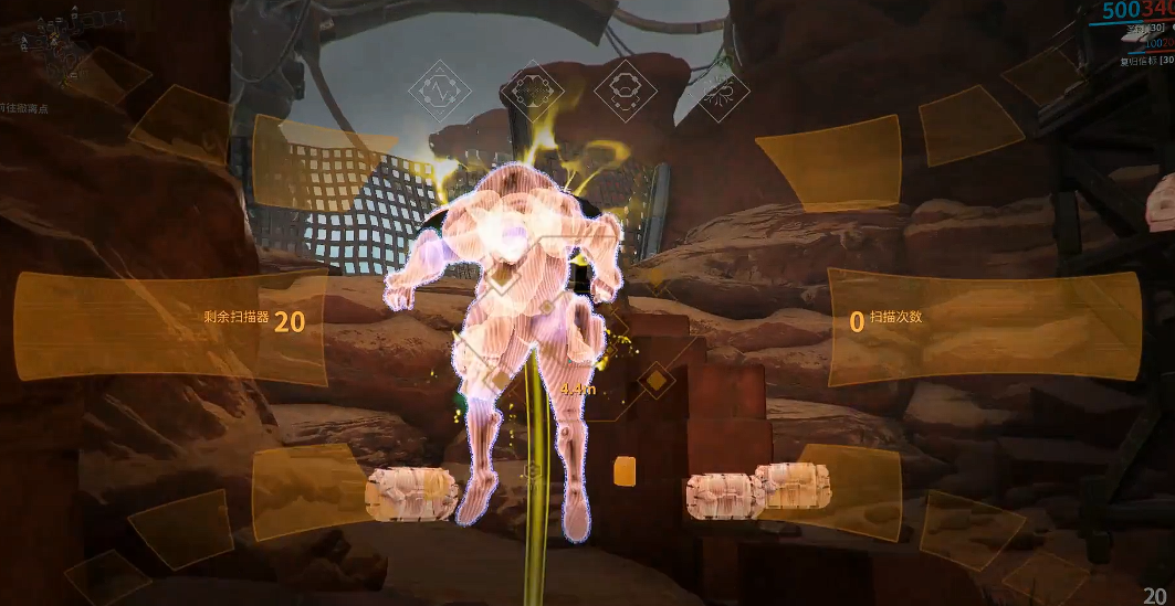任务过程中,精英沙漠枪兵不会在地图上直接标记,但进入任务后大黄脸会语音提示目标出现。玩家需使用结合扫描器右键扫描环境,跟随蓝色脚印痕迹寻找目标。找到目标后,先用动能吸收陷阱将其定身,再用结合扫描器对准其双膝、肘部和躯干的四个光点依次扫描。目标血量较高且会主动攻击,建议选择单人模式避免干扰。