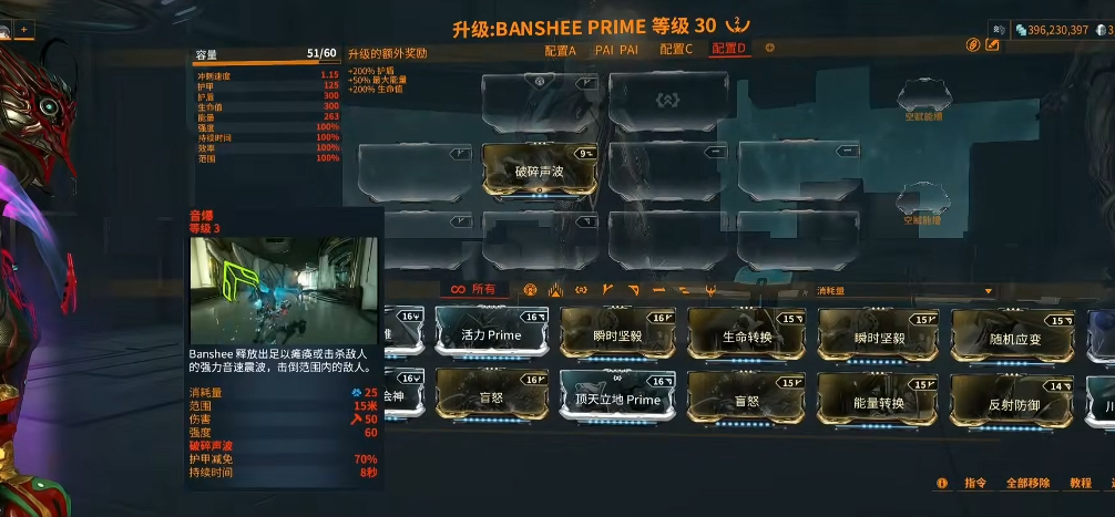 恸哭女妖(Banshee)是星际战甲中一款以声波能力为核心的战甲,定位为支援/狙击与敌群控制。其部件主要通过开启特定虚空遗物获取,设计图在亚希C3遗物中掉落,视光器可通过尼奥K2、尼奥S7或丽斯B5遗物获得,机体需从美索B2遗物的金版掉落,系统则需尼奥B5遗物的金版。建议组建光辉车队以提高效率,所有部件铸造完成后需等待三天制作时间。