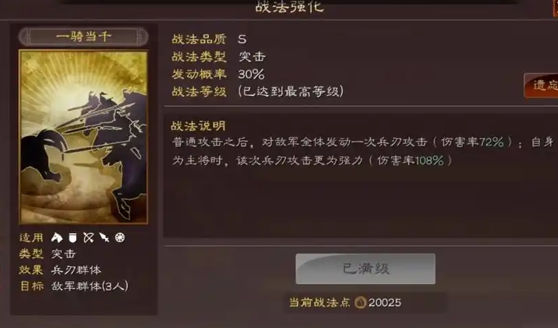吕布在练级时的战法选择是提升练级速度的关键。核心战法包括自带技能天下无双以及一骑当千和鬼神霆威等突击战法,这些能最大化他的输出能力。属性加点应优先提升武力以确保伤害,其次补充速度属性来争取先手优势。战法等级需要优先升满,尤其是天下无双升级后能显著提高发动率从而加速清敌。