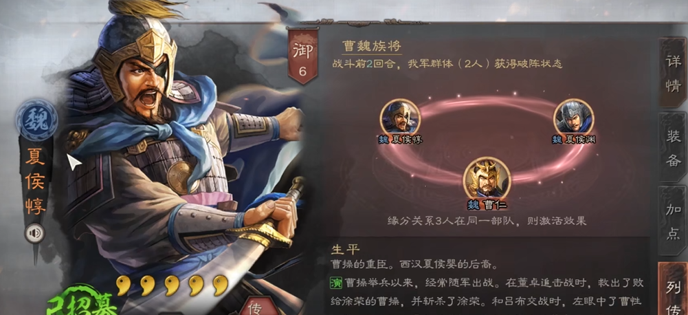 围绕夏侯惇和张飞构建队伍,一个经典且直接的思路是组成反击枪阵容。在这种体系下,夏侯惇充当队伍的前排核心,他需要携带像唇枪舌战或千里驰援这类嘲讽战法,主动吸引敌人的普通攻击,从而高频触发自己的反击效果以及可能携带的后发制人、气凌三军等战法。张飞则作为主力输出点,在得到保护的情况下安稳地释放技能。为了最大化反击收益,队伍常常会搭配白毦兵来提升反击几率,并使用冲轭阵这样的阵法来增加反击伤害。张飞不仅提供回合爆发,其战法若能给敌人附加缴械状态,还能进一步配合夏侯惇的控场或增伤,形成联动。这种阵容追求的是持续作战中的伤害积累,面对以物理普攻为主的队伍时尤其有效。
