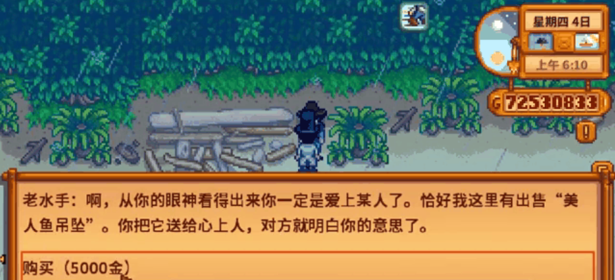 当上面所有条件都满足之后,在一个下雨天的早晨,你就可以出发了。从修好的桥走过去,在沙滩右侧,通常在一块突出的岩石旁边,就能看到老水手站在那里。走过去和他对话,他会问你是否有意中人,并愿意以5000金币的价格把美人鱼吊坠卖给你。确保你兜里有足够的钱,然后买下它。拿到这个闪闪发亮的小吊坠之后,你就可以把它送给你那位已经达到10颗心的恋人了,这等同于求婚,对方答应后,过几天就会举办婚礼。