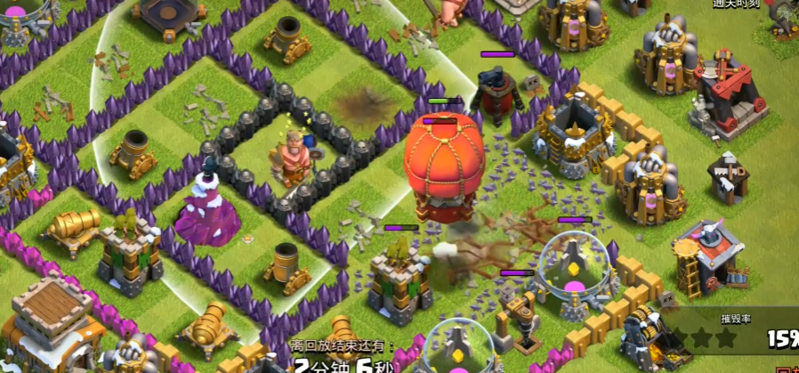 援兵的选择也能增强防守,低本阶段雷龙作为援兵较强势,但高本时超级亡灵或冰人更有效,超级亡灵能快速打出高额伤害,而冰人则能拖延大部队进攻,玩家还可以部署英雄如野蛮人之王和弓箭手女王在防空火箭附近,引导雷龙进入预设杀伤区,提升整体防御能力。