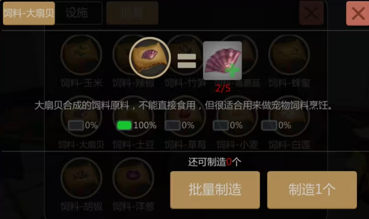 三种核心材料的获取途径各有不同,需要玩家有针对性地进行收集。大扇贝饲料包的基础材料大扇贝主要通过在海滩上拾取贝壳概率获得,收集到5个大扇贝后可以在烹饪锅中制作成一包大扇贝饲料包。罕见饲喂肉是配方中最难获得的材料,需要玩家挑战游戏中的各类王级生物或世界BOSS,例如黑虎王本身、暴力兔王、毒液龙王或熔火蜥蜴王才有几率掉落。而稀有饲喂肉的来源则相对广泛,通过击杀普通等级的棕熊、剑齿虎、暴力兔或沙漠狼等怪物即可获得。