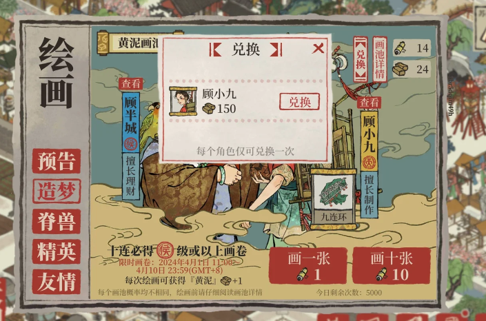 黄泥的最主要且推荐的用途是兑换特定的天级居民。黄泥的核心价值在于提供了一个稳定获取稀有角色的保底途径,当玩家在限时黄泥画池中进行绘画时,每次抽取都将必定获得一块黄泥。积攒到一定数量,通常为150块,即可在对应的画池中直接兑换当期的天级人物,例如玄奘、鱼玄机或王昭君等。这是一种确定性很高的获取方式,每个角色仅能兑换一次。对于目标明确、特别想要某个特定天级角色的玩家而言,将黄泥集中用于此项兑换是最具性价比的选择,它避免了反复抽卡可能带来的不确定性风险。