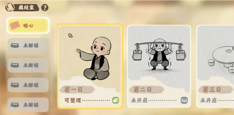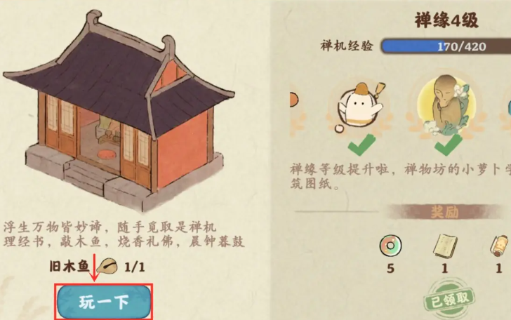 进入罗山寺区域后,你可以找到藏经室的入口,里面主要的玩法是整理经书。这个整理过程有点像移动拼图,你需要挪动一些竖着的书册块,当清理出通路后,就有机会在整理过程中发现被挡住的旧木鱼。每天藏经室都会刷新可以整理的内容,坚持整理经书本身就能获得禅机经验,而获得木鱼算是一个额外的收获。一旦你通过整理经书成功获得了旧木鱼,它就会成为一个你可以随时使用的道具。之后你就可以在罗山寺的场景里,找到一个特定的交互点来使用它,通常是点击庙宇里的一个玩一下之类的选项,就可以开始敲木鱼了。
