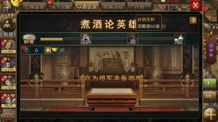煮酒论英雄活动是获取觉醒酒的主要方式,玩家在世界地图上完成运送货物、防范山贼等事件后,有机会获得随机美酒。举办或参与酒宴时,若与他人饮用相同类型的酒,双方都能额外获得觉醒酒奖励。醉意值积累满后,还能触发双倍觉醒效果,进一步增加觉醒酒的收益,这要求玩家提前规划酒品类型以最大化效率。