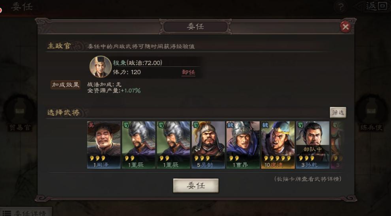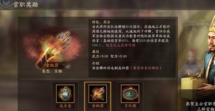 建国后可供分配的国家官职种类繁多,形成了一个相对完整的官僚体系。这个体系大体上可分为文官与武官两大类,其中文官方面主要包括丞相、太尉、太常、太仆、尚书令、侍中、中书令、大司农等职位,它们通常负责国家内政、资源调配、战略制定与外交协调等事务。武官方面则包括各级将军职位,例如太守负责管理特定州府或区域,确保防务与稳定,以及征东、征西、征南、征北将军,乃至更高级别的骠骑将军、卫将军和大将军等,这些官职主要司职军事行动、领兵作战与开疆拓土。官职的多样性允许盟主根据战略需求进行灵活配置,构建一个权责分明的管理团队。