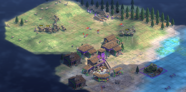 地图左上角的橙色盟友海门会要求用6个村民换取强力援军,建议在确保经济稳定的前提下完成交易以增强军事力量。东侧的拜占庭势力防御较强,早期不宜正面冲突,但可派遣少量部队骚扰其伐木场等经济设施延缓其发展。此阶段应优先升级骑兵相关科技,尤其是血统和攻击力强化,为后期大规模作战做好技术储备。