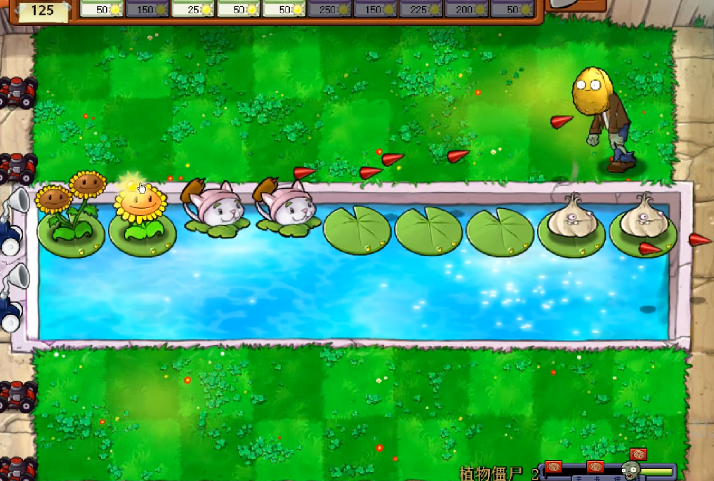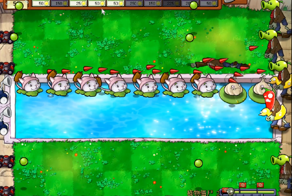 中期阶段需重点防范水路僵尸,补种水草是有效手段。当阳光储备达到5-6个向日葵产量时,可逐步强化防线,例如在水路补充向日葵和大蒜。需注意植物僵尸关卡不会从水中突袭,因此水路防线可相对集中。应保留樱桃炸弹或辣椒等范围伤害植物,用于应对最后一波的密集僵尸潮。