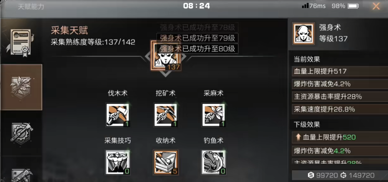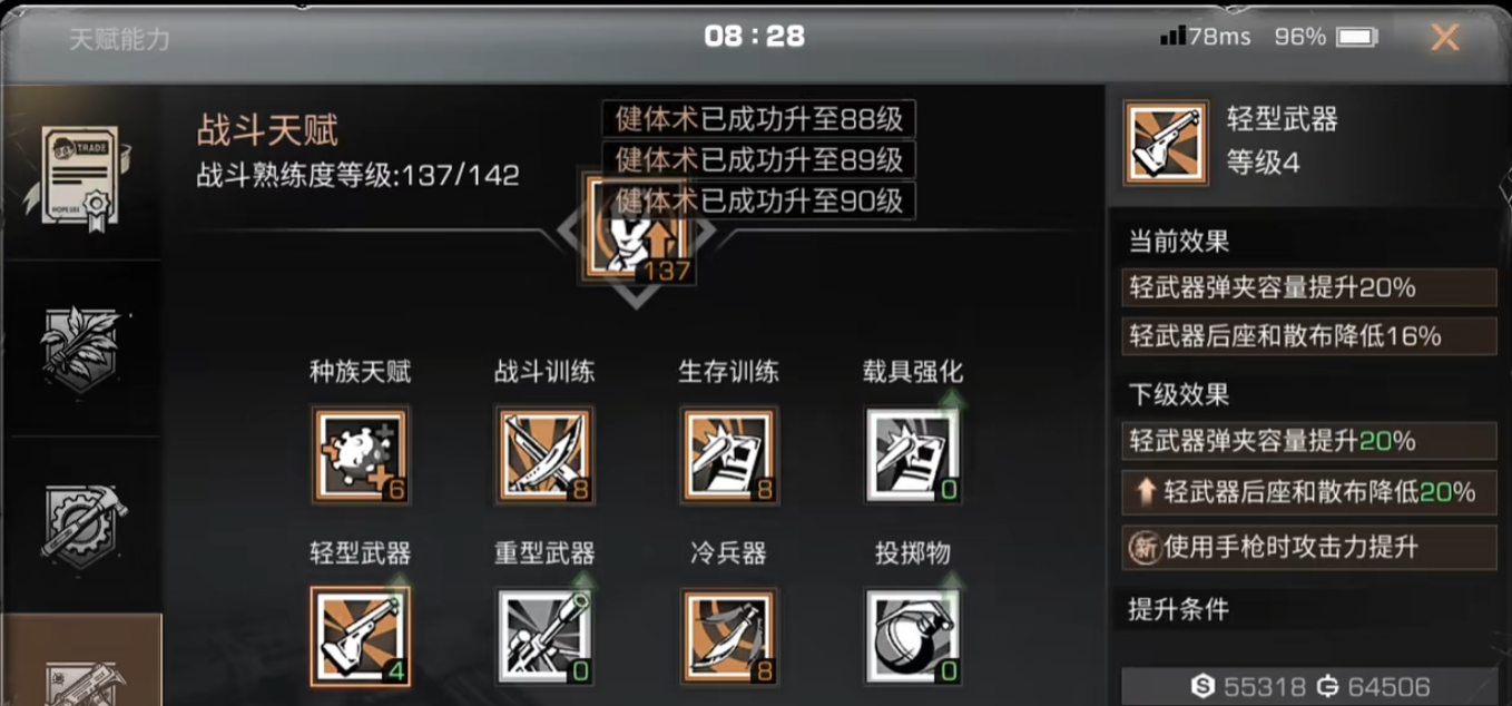 采集天赋的加点很有讲究,初期第一排的基础技能如采麻术、伐木术、挖矿术建议点满,因为它们关系到工具等级和资源采集效率。第二排的蓄力砍伐能大幅提升采集速度,适合中期发展。第三排和第四排的天赋主要增加资源爆率,有条件就点,但强身术这类生存向技能必须优先点满。战斗天赋方面,轻型枪械和重型枪械的选择取决于常用武器,冲锋枪玩家重点加轻型,机枪玩家则选重型,战斗强化则是通用必点项。