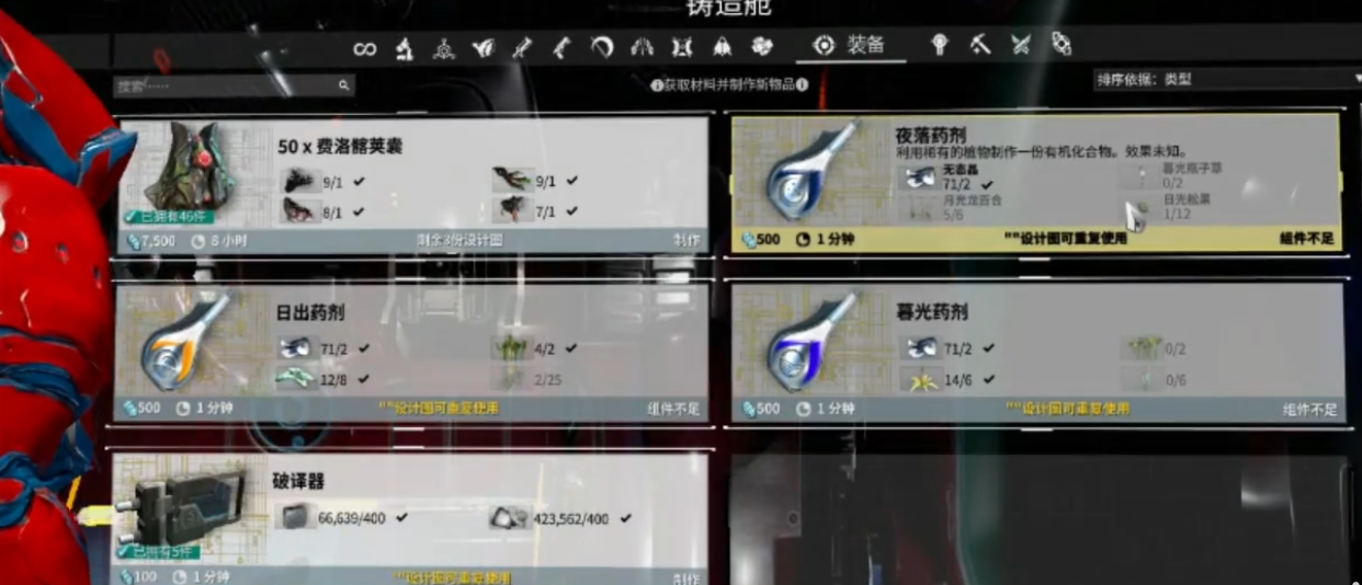 夜落药剂的材料需要提前收集,包括暮光瓶子草、月光龙百合和日光松果。暮光瓶子草在谷神星的废水区域,月光龙百合和日光松果在地球,但要注意地球的昼夜交替,只有在特定时间段才能扫描到正确的植物。制作药剂需要用到铸造仓,收集齐材料后记得提前制作。