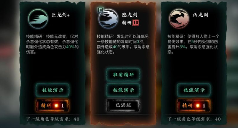技能链构建需注重控制与输出的衔接,巨龙剑作为核心输出技能建议主配永夜无边心法,沉默敌人的同时补充杀意值。剑幕搭配万魔之魂心法获得霸体效果,避免连招被打断,副心法选择暴击加成进一步提升伤害。剑意沸腾这类真实伤害技能则需专注攻击力与技能伤害加成,暴击收益较低。固影噬心的全域定身效果可配合万剑强袭实现范围爆发,心法上优先冷却缩减与破甲属性。