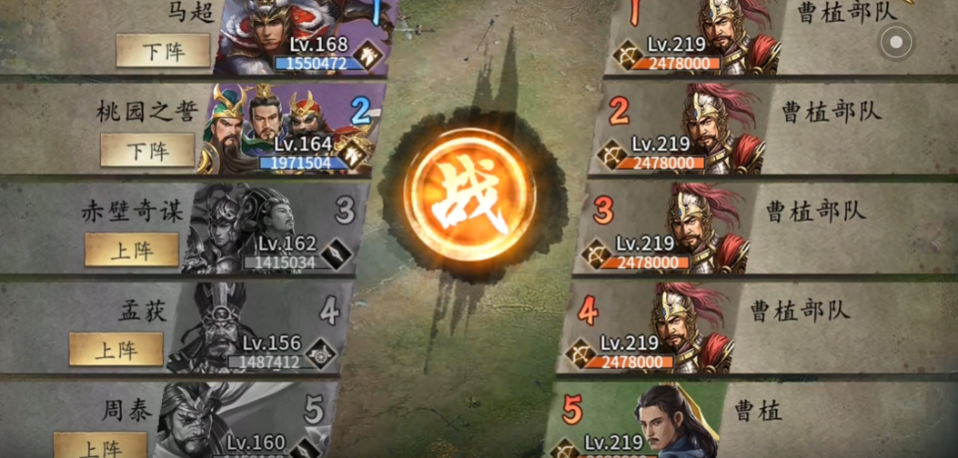 最后关羽上场,极灵龟套装撞死主将曹植的残兵,在NPC点亮第4字前释放觉醒战法,否则会被闪避。如果硬件不足,可以尝试固若金汤打法,孙权一车带副将,配合夏侯战法免伤,火车孙权能打到第三将并吃掉战法。黄月英二车收拾没战法的第三将,再吃第四将战法,曹操最后放战法给周泰加盾。