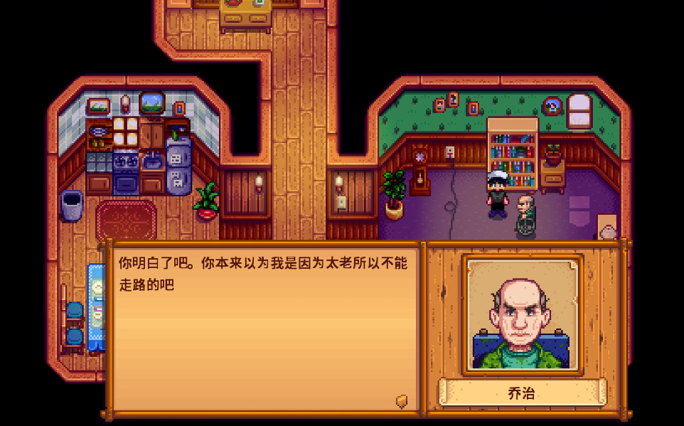 当你们的关系达到3颗心时,老乔治会寄来一份食谱。这时候记得去邮箱查收,这些食谱能帮你做出各种美味料理。继续提升好感度到6颗心时,去他家拜访会触发特别事件。你会看到他想拿书架上的东西却够不着,赶紧过去帮忙吧。他会感谢你的帮助,然后沉默一会儿,接着告诉你他不能走路是因为年轻时不小心用了炸药。这个事件让人感受到他坚强外表下的脆弱一面。