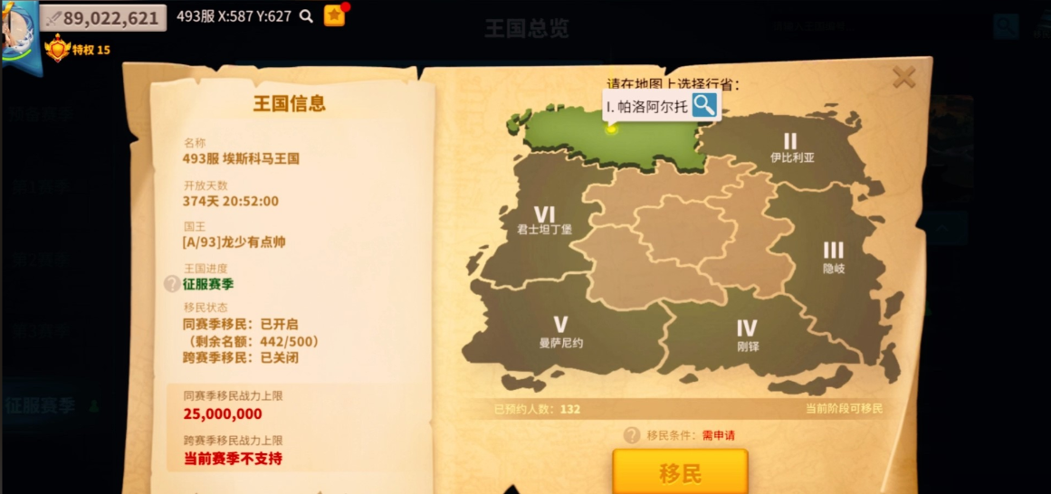 移民操作流程相对简单但需要精准执行。首先通过双指向内滑动缩小地图,点击右下方的地球图标进入王国页面。选择目标K3赛季的王国后点击移民选项,系统会显示所需条件和移民令数量。确认满足所有条件后点击移民按钮即可。成功移民后游戏会自动重启,城市会出现在目标王国的随机位置。