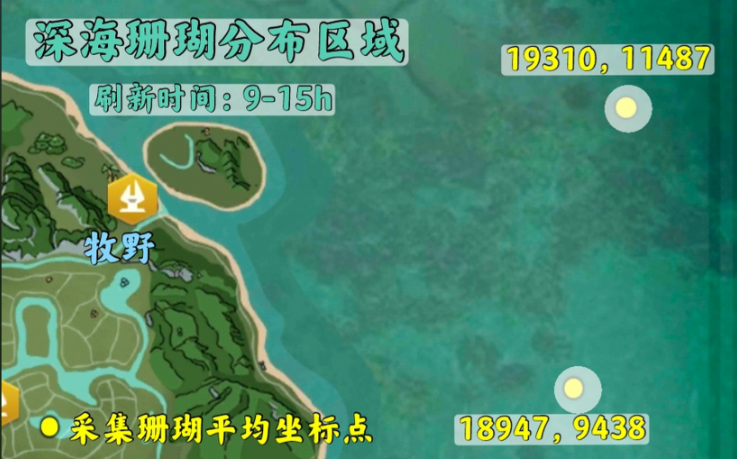 如果想高效采集,可以记住几个常见坐标点:19712,7724、19741,7051、19469,6742、18113,4248、19278,7074。这些点位虽然不是唯一刷新位置,但蹲守时大概率能遇到。建议在上下两个主要区域来回检查,每个点位可能同时刷出两个珊瑚,采集后珊瑚台会消失,每天总共能收集8个。