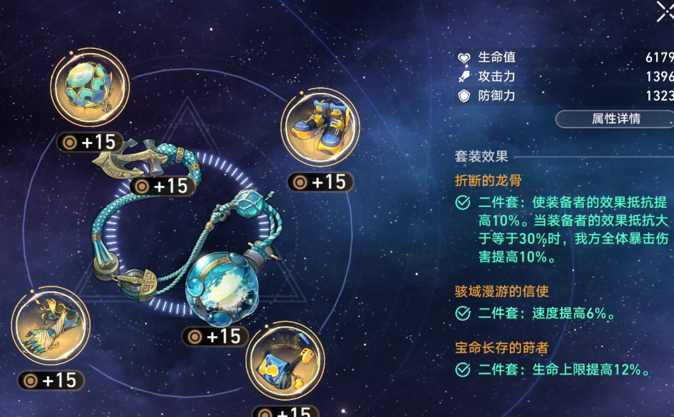 接下来看看遗器搭配,过客逢春木簪四件套搭配不老者的仙舟两件套是最理想的组合,木簪套能提高治疗量还能开场增加战技点,仙舟套则提升生命值并在速度达标时增加全队攻击力。前期过渡阶段可以用2木簪+2铁卫+2仙舟的散件组合,这样能兼顾生存和治疗效果。