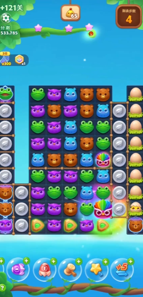 这关里面经常会有魔法石或者花团这样的好东西,咱们前期的工作重点就是想办法把它们激活。比如先消除魔法石附近的小动物,把它点亮了,它自己就会啪啦啪啦炸开,能帮我们清掉不少旁边的银币或者雪块。有时候打掉这些障碍,还会掉下来星星瓶子或者别的染色宝宝,这可都是宝贝。记住一个诀窍,星星瓶集满了能量之后,最好去跟旁边还没充能的染色宝宝交换一下,这么一换,往往就能在星星瓶原来的位置再变出一个新的染色宝宝。要是运气好让两个染色宝宝挨到一块,那交换之后的效果可就厉害了,一下子能变出满屏同一种颜色的小动物,消除起来那叫一个爽快,连左边很难搞的冰块也能一块儿给炸开。