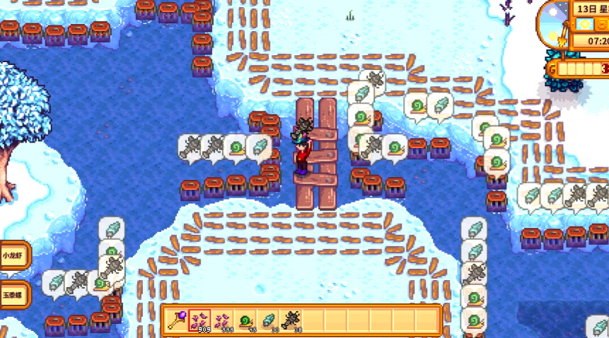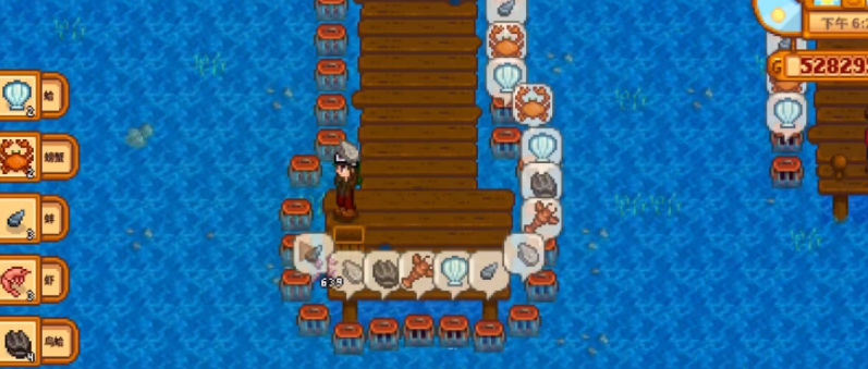 蟹笼是一种重要的水产捕捉工具,主要用于自动捕获龙虾、螃蟹以及蛤、蜗牛等水生生物,其功能性使其成为玩家在钓鱼系统之外获取水生资源的有效补充方式。每次收获蟹笼时还能获得5点钓鱼经验,有助于提升技能等级,部分捕获物还能用于完成社区中心的献祭任务或收藏品收集,为玩家提供了稳定的资源供给。