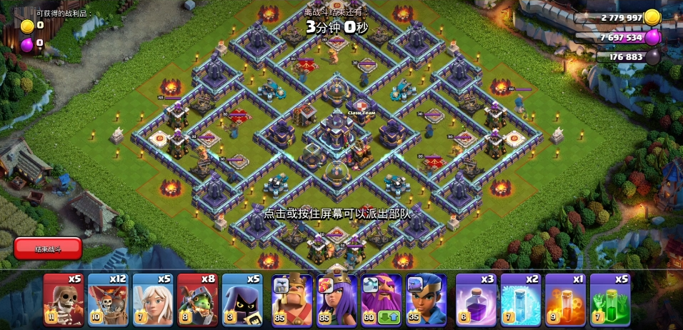 实战细节决定速攻效率,根蔓骑士投放需集中,保证同步推进、集中眩晕防御,避免分散被逐个击破,武神投放要紧跟根部,利用根部抗伤环境安全输出,防止被单点防御集火秒杀。法术投放时机精准,狂暴在主力完全进入核心、面对密集防御时使用,最大化覆盖输出,治疗在部队血量降至一半前使用,提前预判防御伤害,避免残血被秒杀。面对槐树布局的单头塔、多头塔等核心防御,用根蔓骑士优先吸引火力,配合冰冻法术短暂控制,减少部队损耗,同时让武神快速贴近摧毁,避免长时间被高伤防御消耗。