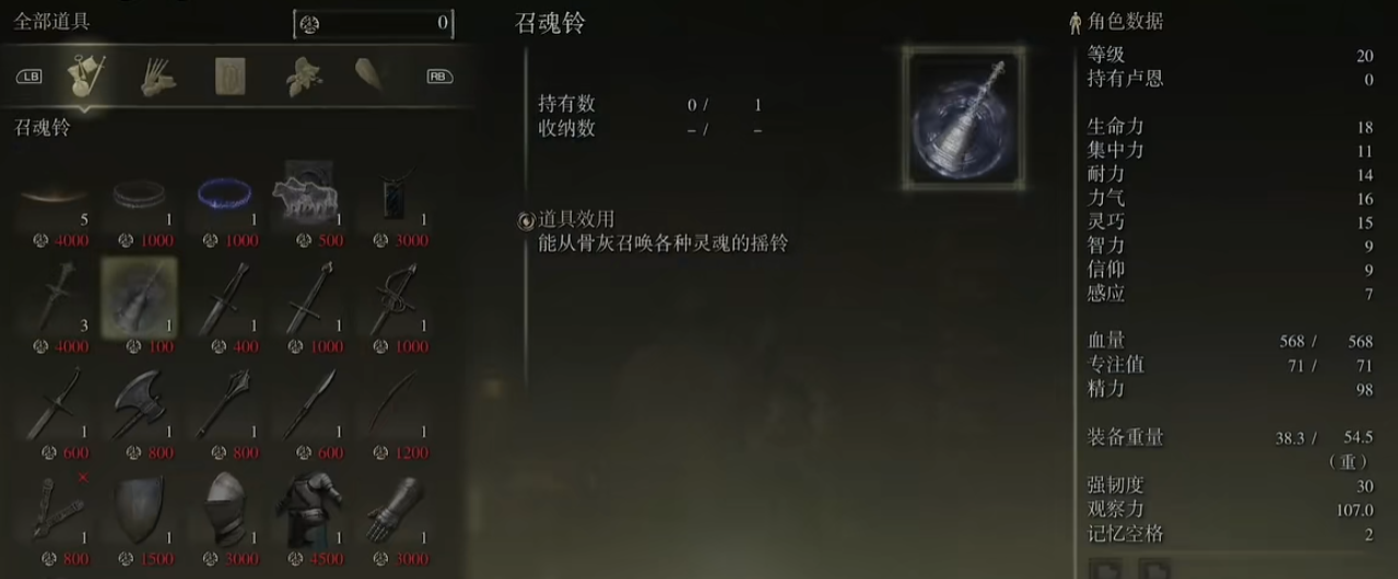 加点方面优先把智力堆到18点以上,这样才能拿得起陨石杖,接着把血量点到20左右防止暴毙。集中力加到21点能召唤无头骑士骨灰,这大哥举着大盾能扛能打,推图和打BOSS都省心。力量加到12或14方便拿龟壳盾或结晶剑,龟壳盾自带铁壁战技能挡大部分攻击,结晶剑则是月隐的下位替代,前期凑合用着不错。别忘了去啜泣半岛的灵庙原野地下墓地刷无头骑士骨灰,106耗蓝但性价比超高。