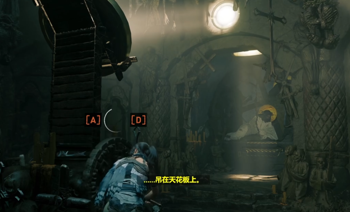 接下来要处理死亡祷告室的机关,这里有三个雕塑透镜需要激活。先把左侧推车推到光柱下,转动转盘让光线照到第二组雕塑。然后去另一边重复操作,让光线最终照到最远处的第三组雕塑。过程中注意躲避巡逻敌人,建议保持蹲行状态。每个开关激活后都会有明显音效提示,听到咔嗒声就说明成功了。