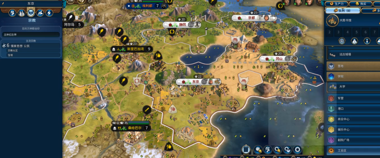 优先建造剧院广场与学院区域,搭配儒家特色建筑国园林,提升文化影响力与旅游业绩。区块规划需兼顾生产力与宜居度,确保人口增长与城市稳定。外交策略上避免主动战争,通过贸易协定、文化联盟与宗教传播扩大软实力,体现和而不同的儒家外交智慧。军事防御仅维持必要规模,重点投资文化项目与奇观,但需警惕AI的宗教胜利,及时用使徒压制敌对宗教传播。
