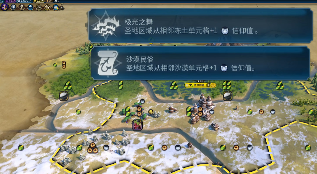宗教胜利是俄罗斯最强势的路线之一。极光之舞万神殿配合职业道德信条,能让圣地在冻土上获得极高的信仰与生产力加成。拉夫拉修道院的半价建造特性使得宗教建筑普及速度远超其他文明。传教士和使徒的快速生产可以迅速覆盖其他文明的宗教影响力,而巡回传教等信条能进一步提升传播效率。需宗教胜利的关键在于早期快速发教,并优先洗低人口城市以降低传教难度。