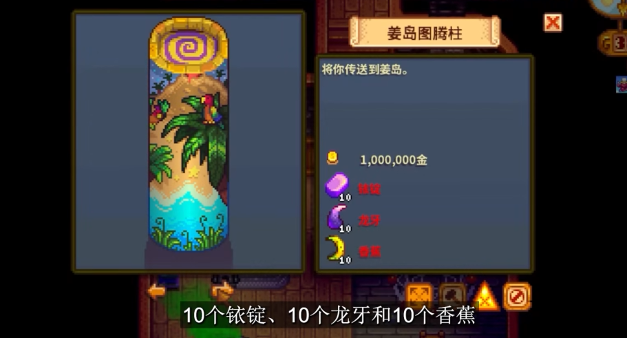 解锁姜岛图腾柱还需准备足够的建造材料,包括金币、铱锭、龙牙和香蕉等。材料的具体数量为100万金币、10个铱锭、10个龙牙和10个香蕉。其中龙牙可通过击杀姜岛火山区域的熔岩蝙蝠或挖掘骨头矿点获得,香蕉则需在姜岛种植香蕉树并收获。铱锭可通过冶炼铱矿石获取,而金币则需要通过农场经营或任务奖励积累。