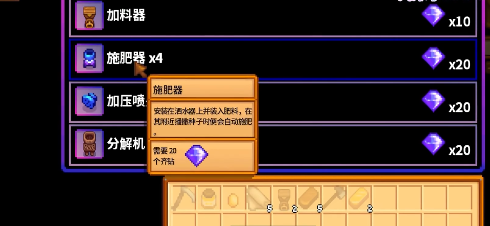 商店齐先生提供季节性作物种子、家具装饰品以及房屋扩建服务。每个季节首日会刷新当季专属种子,这些种子对农场规划至关重要。房屋改造服务包括增加房间、升级设施等,需要消耗特定资源和金币。部分特殊商品如自动采集器等高级设备需要完成特定任务后才能解锁购买资格。