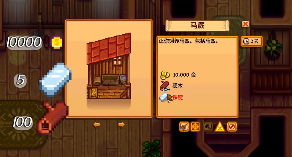 马厩是拥有马匹的前提条件,建造马厩后系统会自动分配一匹马。这匹马会始终与马厩绑定,无论玩家将其骑到地图的任何位置,次日早晨它都会自动回到马厩中。这种设计意味着玩家无法在地图任意位置凭空召唤马匹,必须遵循游戏的物理规则。