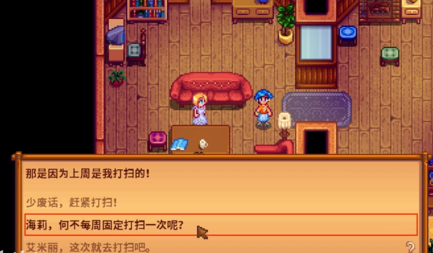 星露谷物语海莉两心任务是提升与这位金发少女好感度的第一个关键剧情。触发条件很简单,只要在艾米丽和海莉同时在家时拜访她们的小屋,就能看到姐妹俩因为打扫沙发垫的问题发生争执。这时候需要你帮忙调解矛盾,选择不同的对话会影响好感度变化。最推荐的选择是提议让海莉每周固定打扫,这样能增加30点好感度,其他选项要么会降低好感,要么无法推动剧情发展。