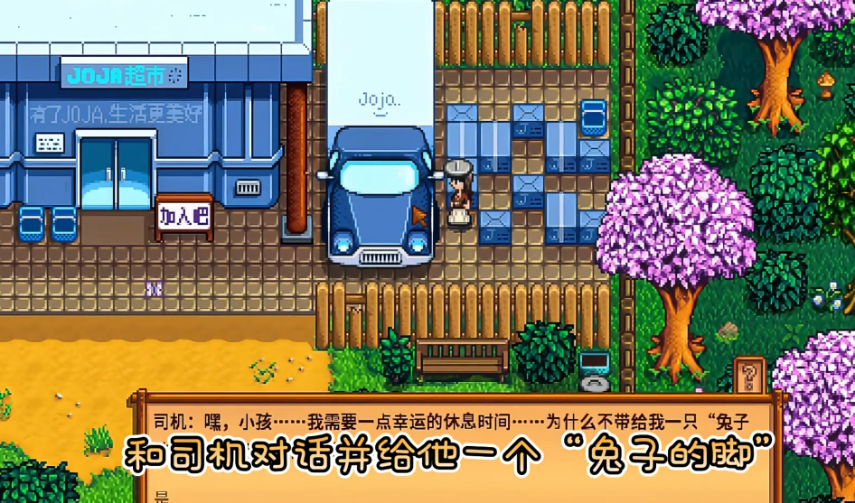找到货车司机是整个过程的核心环节,不管咱们是跟着纸条提示绕镇一圈,还是直接去超市门口的货车那里都行。和车窗里的司机对话时,他会向咱们索要一个幸运兔子脚作为交换物。如果背包里没有兔子脚也别着急,可以回家看看养的兔子有没有掉落,记得平时多和兔子互动培养好感度,这样它们才会更愿意送出脚掌哦。