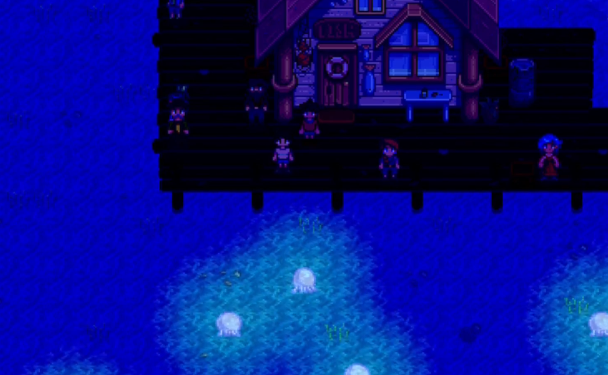 月光水母起舞在夏季第28日晚上10点开始,同样是沙滩举办。这个节日更像是一场浪漫的仪式,刘易斯会点亮烛火吸引水母,整个海滩被蓝色光芒笼罩。如果已经结婚或订婚,伴侣会站在身边一起欣赏。虽然没什么实际奖励,但水母迁徙的画面非常治愈,算是夏季最美的时刻之一。除了节日,夏天还能解锁温泉和铁路区域。温泉是恢复体力的好地方,泡的时候记得别乱动;铁路偶尔会有火车经过,可能会掉落随机物品。