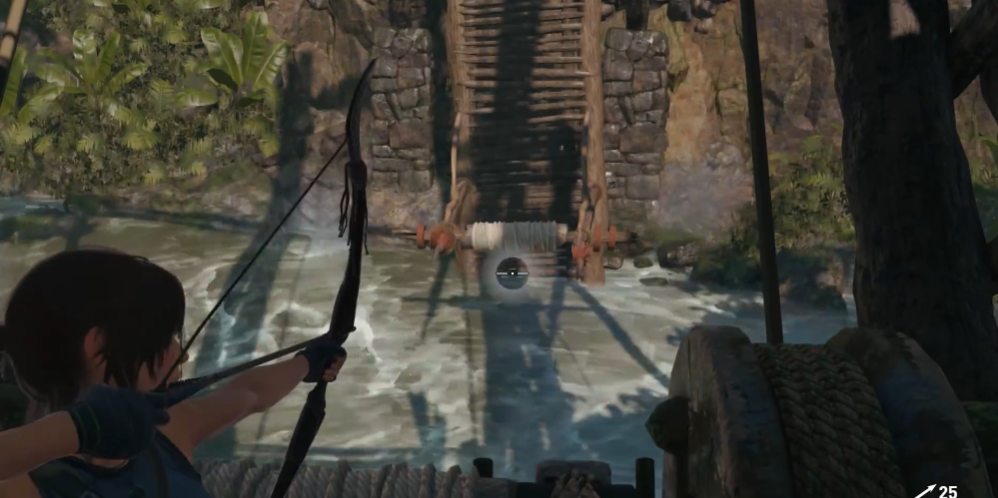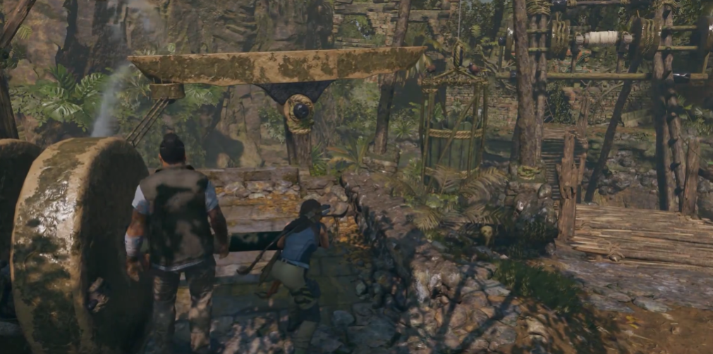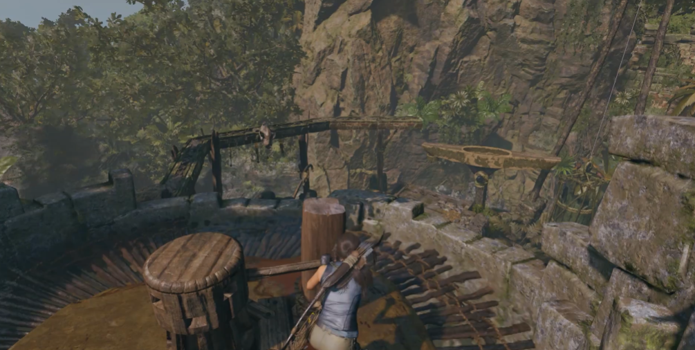 秘鲁丛林的断桥关卡是游戏早期的关键谜题之一。玩家需要利用水利机关和绳索箭矢的配合才能顺利通过。首先来到断桥前,根据人物对话提示,需要登上水塔顶部开启排气阀。沿着石轮后方的木梯攀爬至塔顶,拉动开关启动水塔运作。水流会注入下方的绿色容器,但容器存在破损,因此必须迅速完成后续操作。