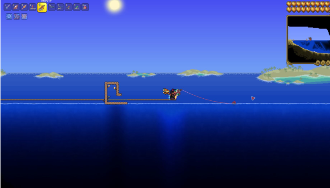 钓鱼活动可以在任何达到足够大小的水体中进行,通常一个约18格宽、18格深的水坑就足够了。垂钓时,玩家角色不能完全浸入水中。在不同的生物群落,如森林、沙漠、丛林、雪地、海洋或地狱,能够钓起完全不同的鱼类、装备和宝箱。若要在岩浆中钓鱼,除了使用熔线钓钩,另一个方法是装备防熔岩鱼钩饰品,它可以让你用任何钓竿搭配岩浆鱼饵或地狱中捕获的蝴蝶、蜗牛进行垂钓。