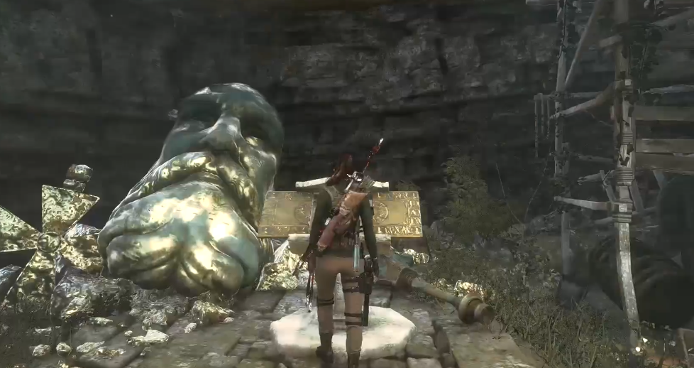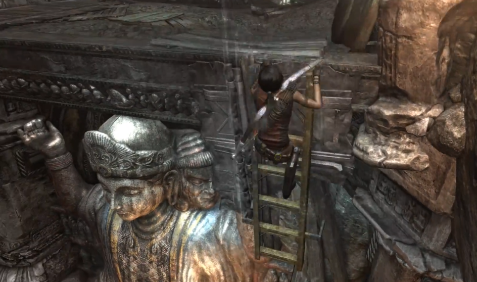 当梯子左侧升起后,道路便暂时通畅,此时可以将之前停在半路的第一台滑车完全推过梯子下方,一直推到场景右侧的另一个重物下方。用绳索将梯子的右侧与右边的第二尊小神像连接起来。连接好后,再次从二层平台跳到右侧的重物架子上,利用同样的原理将右侧的小神像拉高。当两侧的雕像都通过滑车和重物系统被提升后,它们会共同将中央的梯子完全拉起至竖直状态。梯子便成为通往高台的通道。直接爬上这座完全立起的梯子,就能到达古墓的终点。