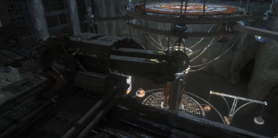 穿越通道的核心是解决太阳系仪谜题并应对紧随其后的不死军团围攻。太阳系仪是通往基特城的关键天文设施,解开它并不算太复杂,主要分为两部分,首先需要操作场景中的三根杠杆,射击它们的平衡锤使其顺时针旋转,以此在内部搭建出一条通往左上方平台的道路,解除那里的第一个制御装置,随后跳到对面平台解除第二个装置,整个太阳系仪就会开始运转,打开通向出口的道路。解开谜题后,会有一段很长的赶路路程,临近尾声时会触发一段过场动画,劳拉将目睹桥上列队行军的不死军团,紧接着就需要与它们展开正面战斗。