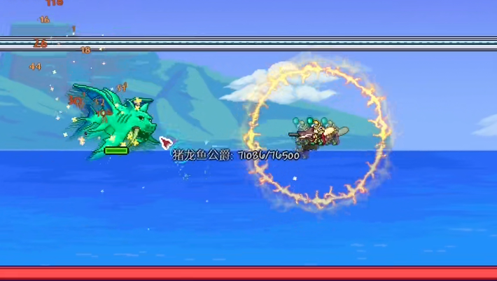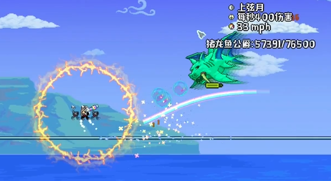 相较之下,猪鲨公爵的挑战被普遍视为更高的门槛,其机制对玩家的操作反应、战场理解和装备水平提出了严苛要求。猪鲨必须在海洋环境中召唤,一旦离开水域便会进入狂暴状态,伤害与防御大幅提升,这本身就限制了战斗场地的构建策略。它的攻击模式复杂且具有多阶段性,融合了高速冲刺、追踪气泡、具有吸附力的鲨卷风以及后期的瞬移能力,整个过程需要玩家持续进行高精度机动。在拥有世纪之花后提供的装备支撑下再来挑战猪鲨,会显著降低战斗的容错压力。