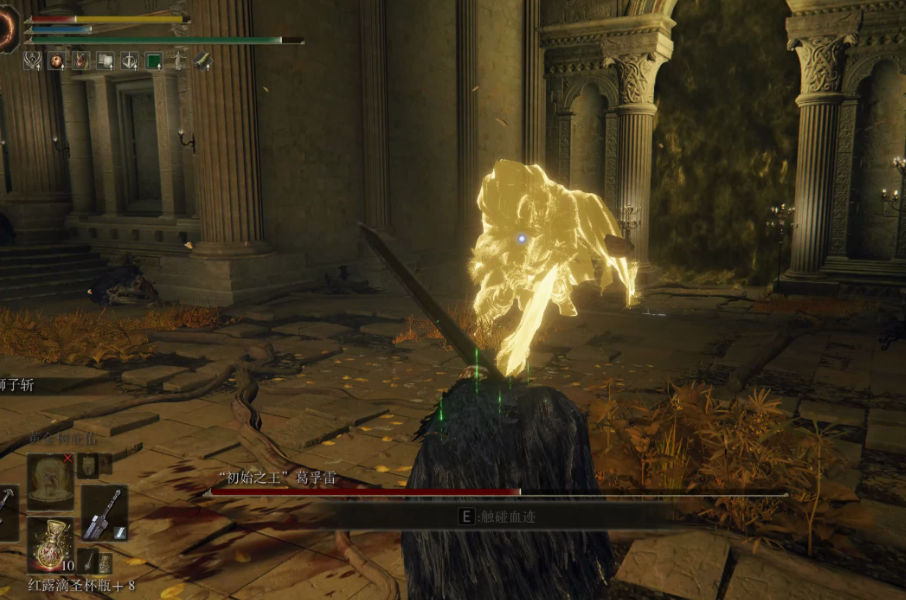 战斗的第一阶段,葛孚雷以手持巨型战斧的金色幽灵形态出现,此阶段的策略重点在于观察和应对其物理攻击。他的攻击速度相对较慢,招式较为单一重复,主要包括大范围的跳跃劈砍、斜向挥砍以及具有延迟判定的震地冲击波。应对跳跃攻击需要及时跑出其落点范围,而处理斜劈时,向其左前方翻滚可以躲避第一击,再衔接一次向前翻滚便能抵达其身后安全位置进行反击。需要特别注意的是其抬脚震地攻击,该动作发生后大约有两秒的延迟才会产生冲击波,切忌过早翻滚。对于法师或远程职业,在此阶段保持安全距离进行持续消耗是较为稳妥的策略;近战职业则需耐心等待其招式结束后的硬直窗口进行输出。