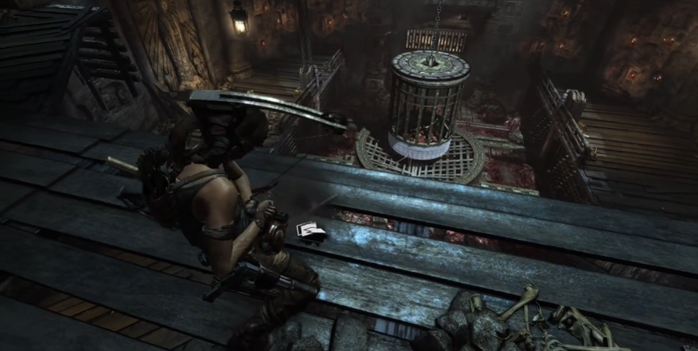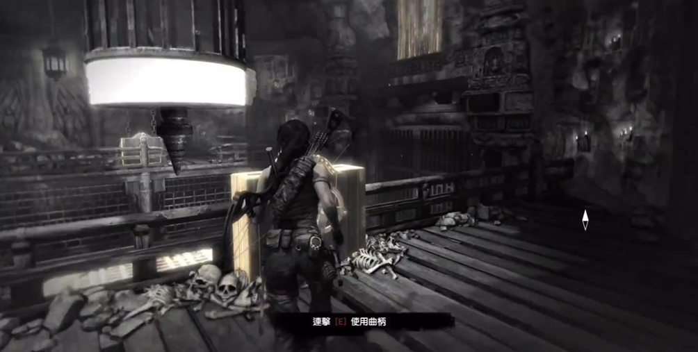 解谜的核心操作始于对两个对称闸门的控制。你需要转动房间大门左侧的闸门,这个操作会将位于房间中央圆形机关下方的大铁笼提升上来。待铁笼完全升起后,返回二楼平台,在正对铁笼的位置使用弓箭瞄准其底部并射击,这会使铁笼产生摆动并砸向对面墙壁的薄弱处,从而为后续通行创造缺口。接着至关重要的一步是进行机关重置:你需要前往房间右侧,操作那里的铰链或控制杆以关闭地井盖。完成此操作后,再次转动最初升起铁笼的左侧闸门(或与之对应的另一个开关),将铁笼降下至合适的高度。这一系列操作的目的是创造出一个稳定的、可供摆荡的支点,并确保下方通道处于封闭的安全状态。