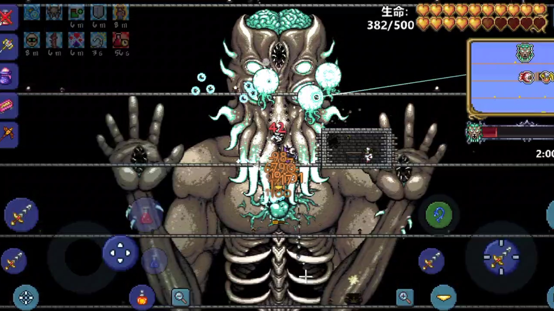 石巨人位于丛林神庙,使用丛林蜥蜴电池召唤,第一阶段攻击拳头与头部,第二阶段躲避其跳跃与光束攻击,击败后解锁更多游戏内容。拜月教邪教徒在地牢门口生成,击败后触发天界事件,出现太阳、星云、漩涡、星尘四根天界柱,逐一摧毁后召唤最终boss月亮领主。月亮领主拥有多个攻击部位,先摧毁手部与头部的眼睛,再攻击核心,需准备终极装备、满增益药水与宽敞战斗场地,是游戏最终挑战。